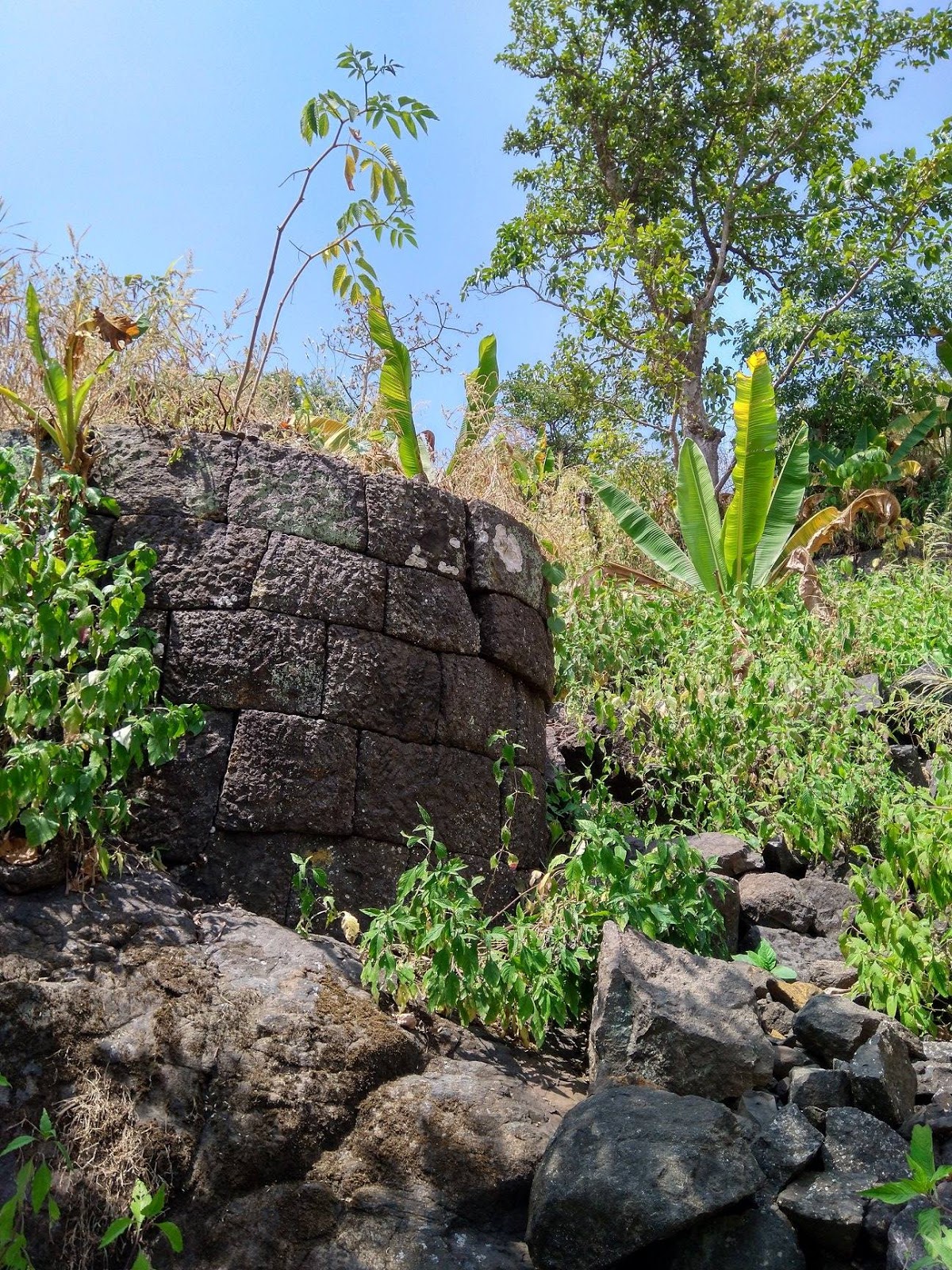 ह्या जंगलात बांबू ,केळीची आणि सागाची झाडे आहेत. केळीची झाडे तर पदोपदी दिसतील आणि अत्यंत उंच झाडे आहेत. ३.३० तासाच्या दमछाक करणाऱ्या चढानंतर आम्ही किल्ल्याच्या मुख्य प्रवेशद्वारात प्रवेश केला जिथे आपल्याला बुरुज लागतो आणि बाजूलाच तटबंदीचे अवशेष दिसतात.