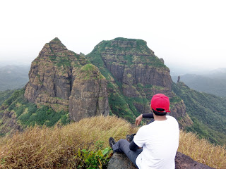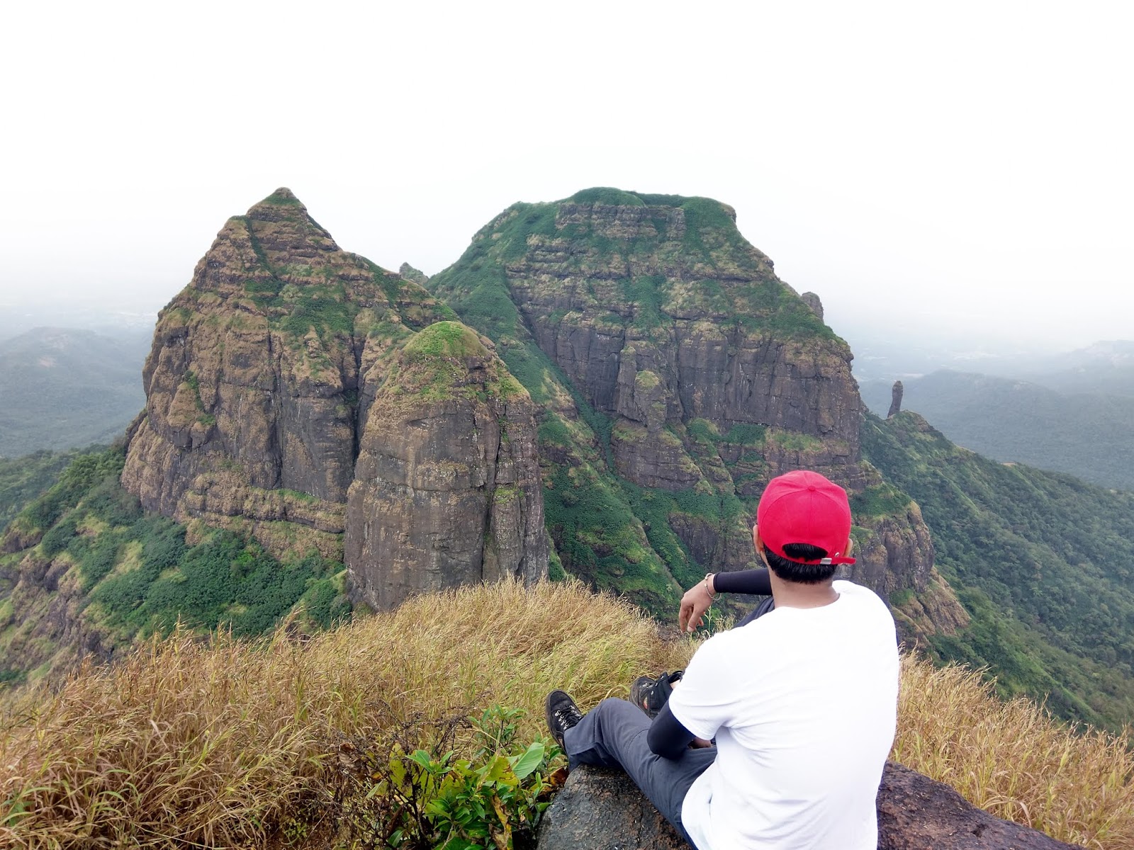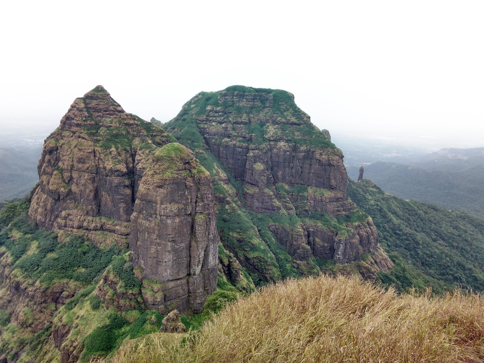पायथ्यापासून दिसणारा माहुली किल्ला नवरा आणि नवरी सुळक्यांसह
