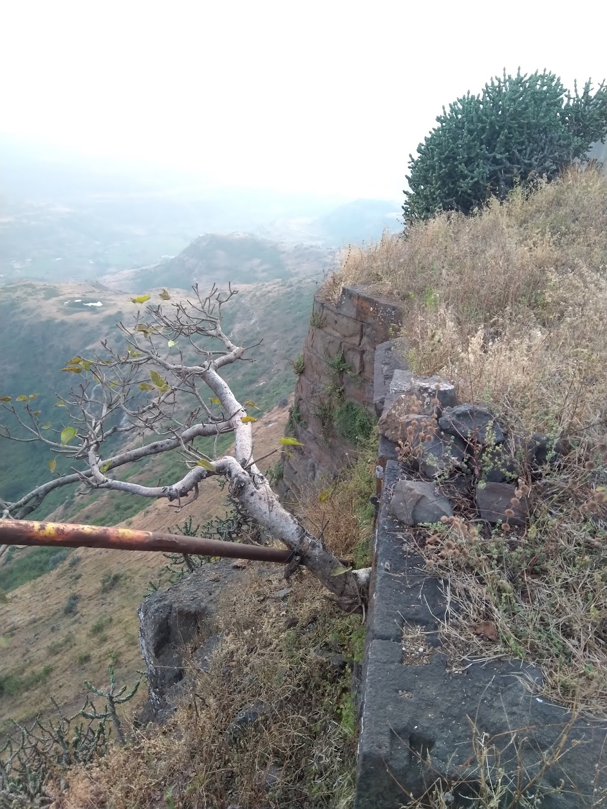 गुहा पाहून कातळात खोदलेल्या पायऱ्यांच्या मार्गाने उद्धवस्थ प्रवेशद्वारातून किल्ल्यात प्रवेश केला.प्रवेशद्वाराच्या डाव्याबाजूला कमानीचे अवशेष सापडतात.किल्ल्यावर प्रवेश केल्यावर समोरच समुद्र किनारी पहायला मिळणारे खडकांसारखे कातळ दगड दिसतात.हेच कातळ चढून खरं उजवीकडे जाऊन अवशेष पाहून परत डावीकडे यायचे परंतु आम्हाला मामांनी मुद्दाम डावीकडे नेऊन अक्खा किल्ला फिरवून उजवीकडील भागातून परत मूळ ठिकाणी आणले आणि मला वाटते तेच योग्य आहे.डावीकडे गेल्यावर २ गुहा दिसतात ह्या गुहांमध्ये उतरायला लाकडी शिडी आहे.ह्याच मार्गाने किल्यावर फिरताना असंख्य टाकी आहेत.टाक्यांनंतर शिव मंदिर पण पाहायला मिळते. पुढे वाटेत एक वास्तू लागते जिला एक्दम छोटा दरवाजा आहे हि वास्तू म्हणजे नक्की काय आहे ते मात्र उमगत नाही.डावीकडून उजवीकडे चालायला लागल्यावर आपल्याला समोर कोळधेर आणि इतर नाशिक मधील किल्ल्यांची रांग जर धुरकट वातावरण नसेल तर स्पष्ट दिसते.