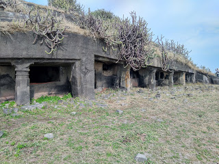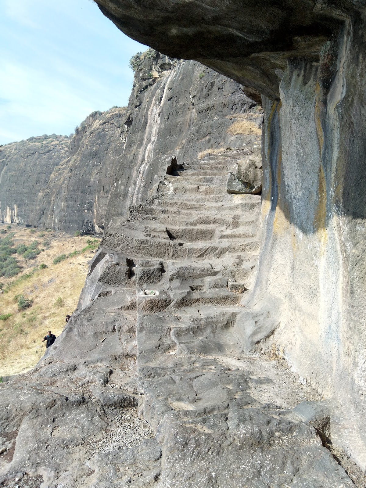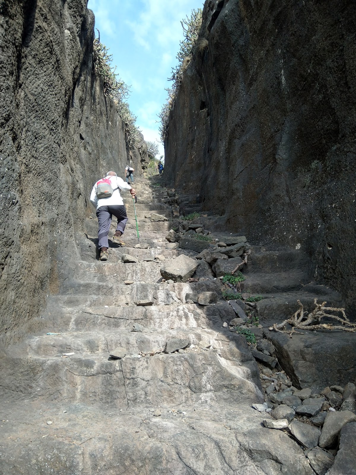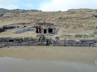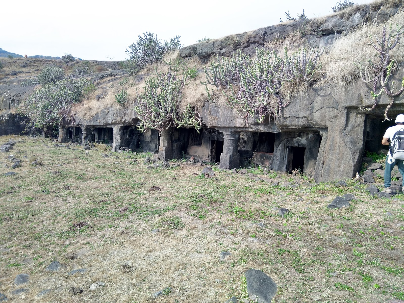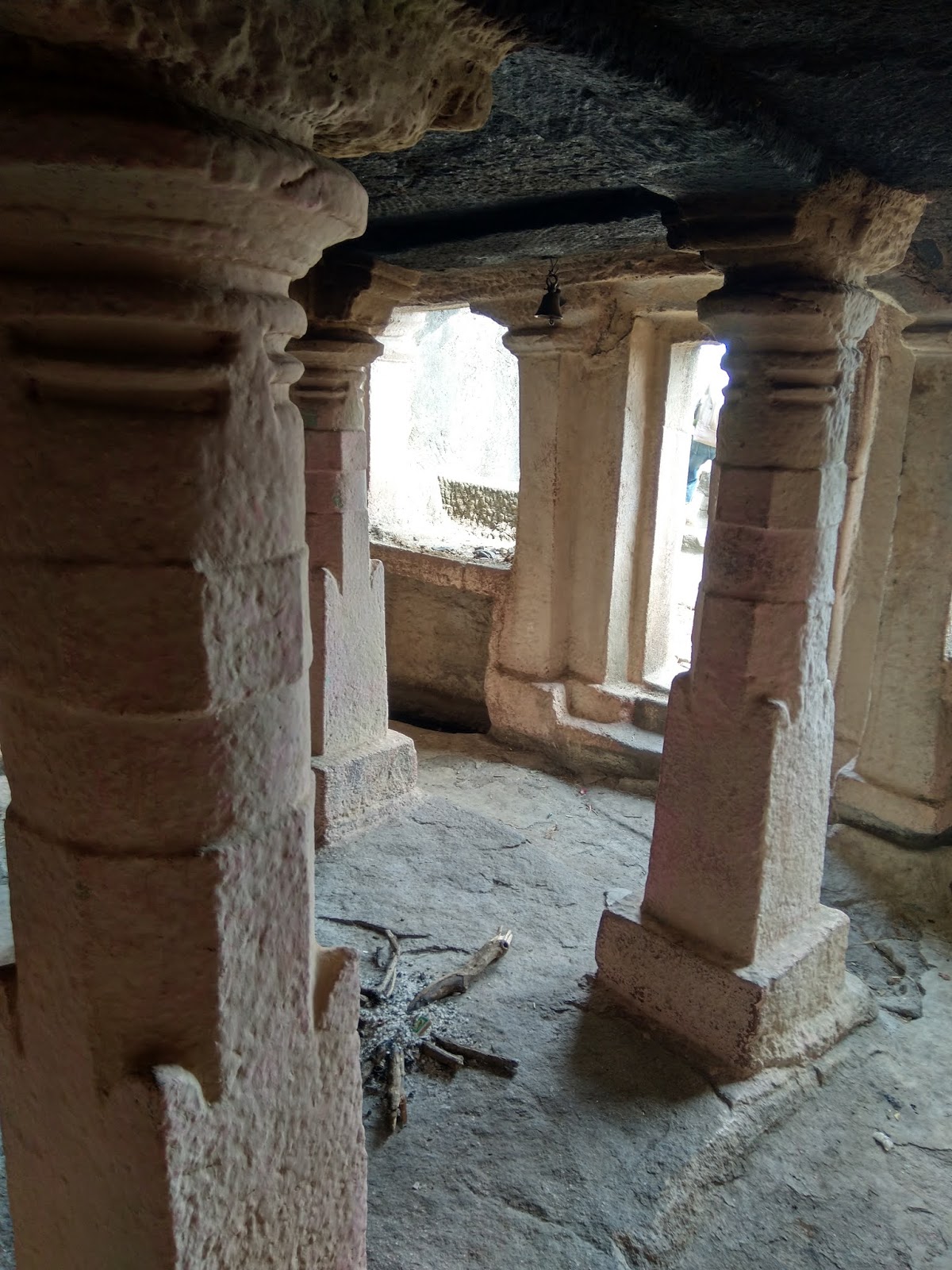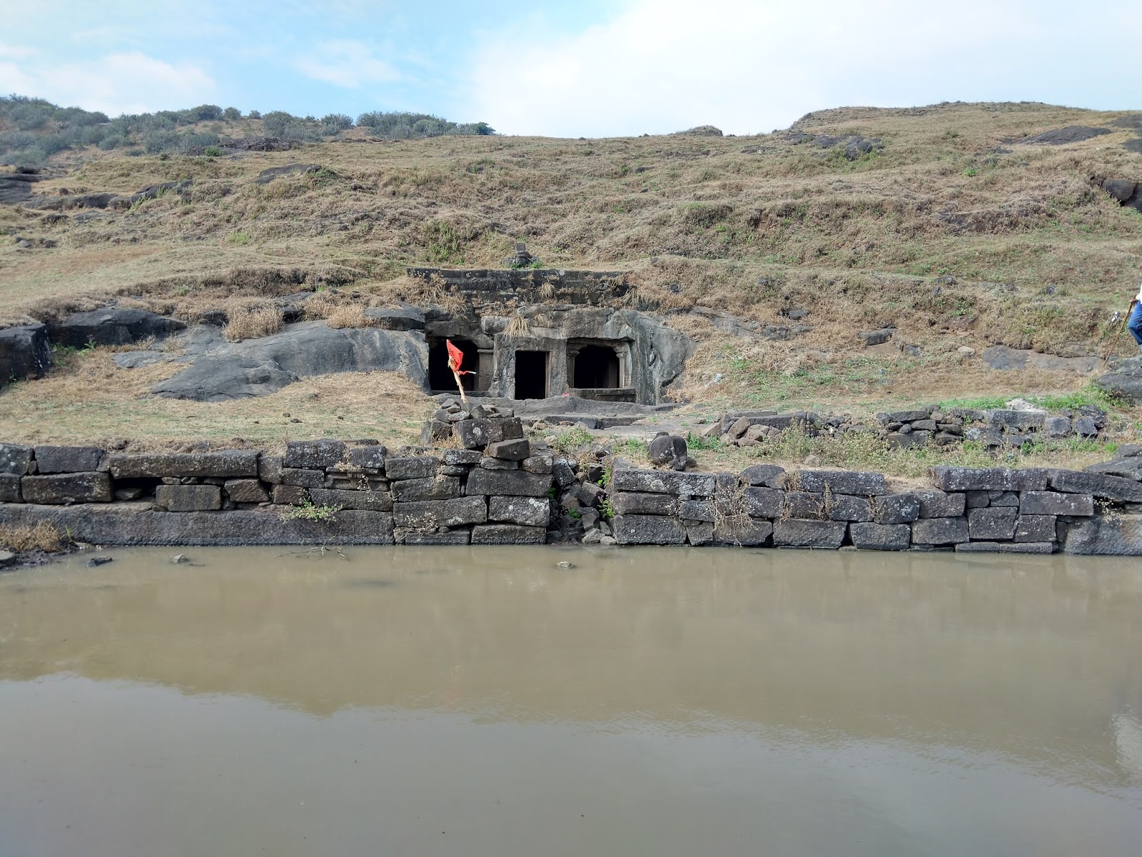 हे पाहून सरळ चालत राहिल्यावर वाटेत गडाचा  माथा गाठण्यासाठी कातळात कोरलेल्या पायऱ्या लागतात, येथून वर जाऊन पुन्हा खाली यायचे आणि सरळ चालत गेल्यावर एक १८-२० गुहांची रांग लागते गुहेचे प्रयोजन काय व कशासाठी आहे ते मात्र कळत नाही. मात्र ह्या गुहा पुरातन वाटतात आणि ह्या गुहांवरून किल्ल्यावर भरपूर वर्दळ असणार हे हि जाणवले.एका सरळ रेषेत ह्या गुहा सुंदर रित्या कोरल्या आहेत.ह्या गुहा पाहून पुढे गेल्यावर पुरातन हेमाडपंती खांबाचे महादेवाचे मंदिर लागते . महादेवाच्या मंदिरासमोर नंदी आहे आणि नंदीच्या समोर बांधीव दगडी तलाव आहे.येथून मामांनी आम्हाला किल्ल्याला वळसा घालून नेले . अर्थात आल्या वाटेने पण मागे येता येते परंतु मामांनी आज चंगच बांधलेला किल्ल्याचा एक एक अंश आम्हाला  दाखवण्याचा.  वाट सरळ चालत जाण्याचीच होती परंतु तरीही माझ्या मते बरोबर वाटाड्या असावा.