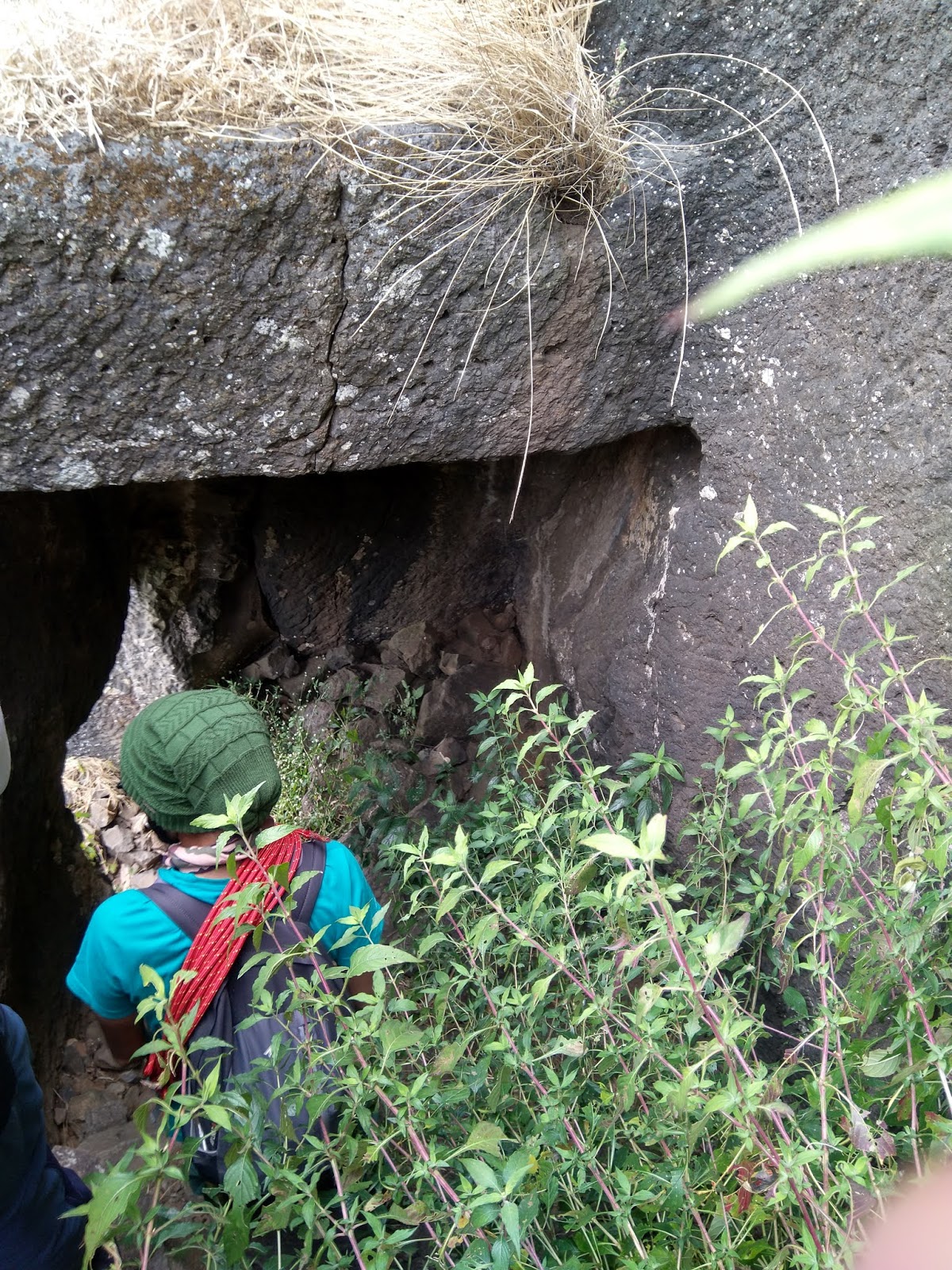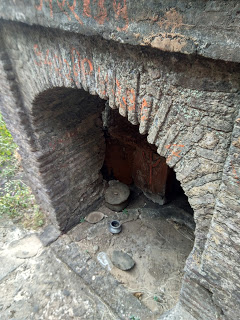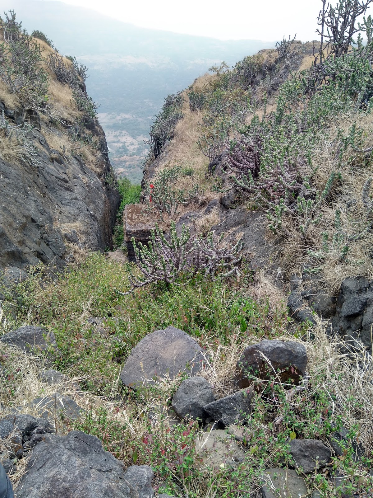 महादेव मंदिर पाहून मामांच्या मागे आम्ही शेवटची आगळी वेगळी किल्ल्यावरची वाट पाहण्यासाठी चालू लागलो.वाटेत एका सरळ रांगेत दगडांना असंख्य छिद्र खोदलेले दिसले ज्याचे प्रयोजन नाही समजले.ह्या शिवाय काही अजस्त्र टाकी आणि गुहा पण वाटेत लागतात त्यातली एका लांब गुहा मामांच्या सांगण्याप्रमाणे ते त्या कालचे कारागृह आहे असे समजले परंतु त्याला काही लेखी आधार नाही आहे.आता किल्ल्याला जवळ जवळ  वळसा घालून झालेला होता. पुढे एक सरळ वाट उध्वस्त प्रवेश द्वाराजवळ  घेऊन जाते  जीथून किल्ल्यावर प्रवेश होतो आणि दुसरी चोर वाट जी मी  सुरुवातीला म्हंटल्याप्रमाणे किल्ल्याच्या  पायऱ्या दिसताक्षणी लांब पाण्याची खोदीव टाकी दिसतात तिथे निघते.त्यासाठी सरळ न जाता  उजवीकडून खाली उतरायचे खाली निमुळत्या वाटेत बाजूला एक पेशवेकालीन छोटे मंदिर बांधले आहे. ह्या मंदिरात त्रिशूल कोरलेली शिळा आणि भग्न अवस्थेतील मूर्ती दोन्ही शेंदूर फासून ठेवले आहे .हि वाट अवघड नाही आहे परंतु जपून जावे मंदिर पाहून खाली उतरून पुन्हा निमुळत्या वाटेने कधी बसून , कधी वाकून आपण टाक्यांजवळ  उतरतो.मी मुद्दाम पुन्हा सांगेल कि हा किल्ला आपण जाधव मामांसोबतच बघा आणि ह्या  चोरवाटेचा आनंद घ्या.