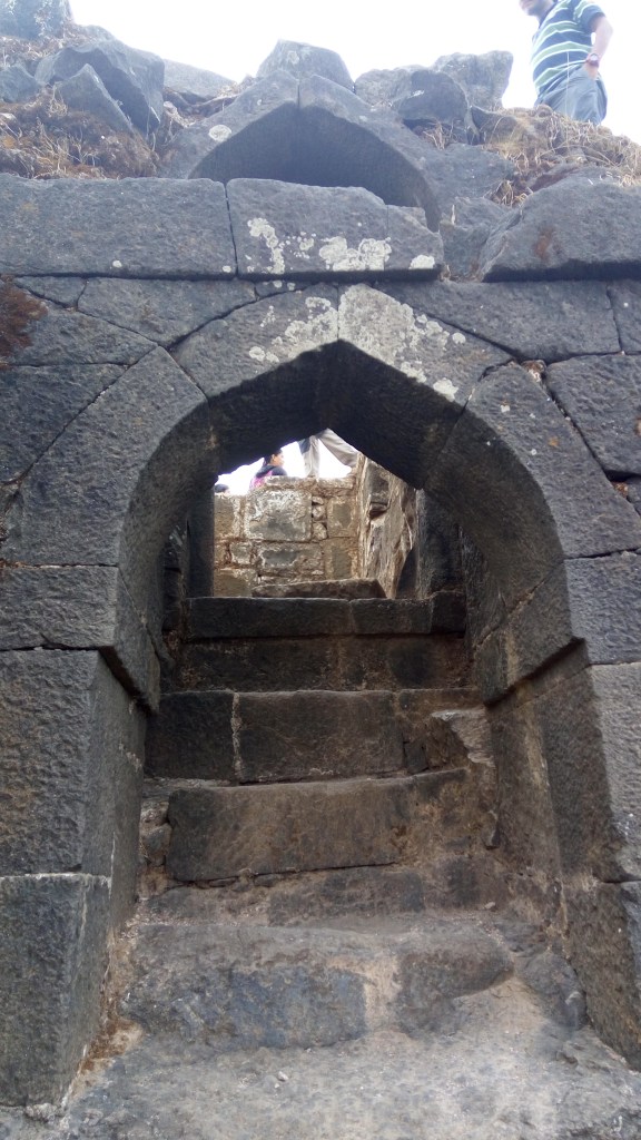 ह्या शिलालेखावरून स्पष्ट होते कि इ.स १७६० (शके १६८२) साली किल्ला मराठ्यांकडे होता व किल्ल्याचा तट, बुरूज, दरवाजा किंवा अन्य वास्तू यांचा जिर्णोद्धार केला गेला.मंदिरात श्री राम ,लक्ष्मण आणि सीता मातेची मूर्ती आहे.मंदिर छोटेखानी आणि सुंदर आहे.मंदिराच्या डाव्या बाजूस पाण्याचे टाके आहे.हे पाहून सरळ पायरी मार्गाने चालत आपण उध्वस्त प्रवेशद्वाराने किल्ल्यात प्रवेश करतो.