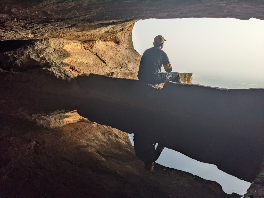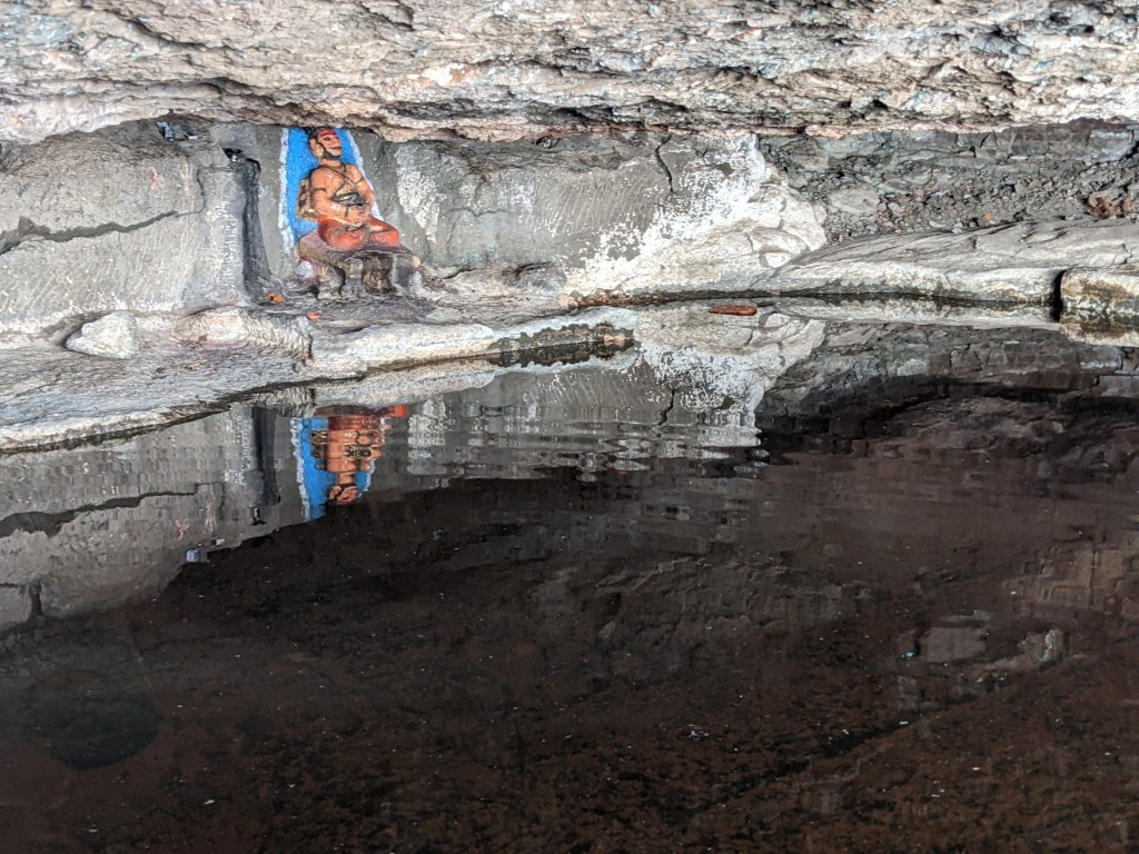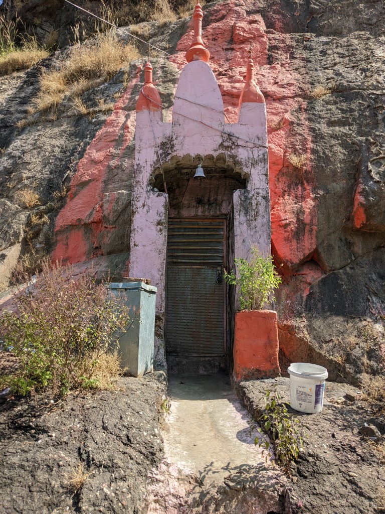 गुहेपासून पुढे वाट खूप निमुळती आहे त्यामुळे थोडे सांभाळून जावे.उजव्या बाजूला वळल्यावर गुहा लागते. इथून पुढे मात्र शक्यतो प्रस्तरारोहणाचे साहित्य असल्यास वर जाऊ नये. तसेही वरती भगव्या झेंड्याशिवाय अवशेष नाही असे मला समजले.जेव्हा तुम्ही प्रवेश करता आणि गुहेत पाहता तेव्हा एक सुखद धक्का बसतो.गुहेतील पाणी आरशासारखे स्वछ आहे. आपले प्रतिबिंब अतिशय सुस्पष्ट पाण्यात दिसते.आम्हा सर्वांना भर उन्हात गड चढल्याचे सार्थक वाटले. गुहेतून समोरच्या बाजूला उभे राहून उत्तम छायाचित्र काढता येतात.जर तुम्ही सूर्य मावळतीच्या तासभर आधी आलात तर आणखी उत्तम.गुहेत गोरक्षनाथांची मूर्ती ठेवली आहे. गुहेत मनसोक्त वेळ घालवून गड उतार झालो.एव्हाना संध्याकाळ झाली होती.दिवसभराच्या ट्रेकिंग मुळे जोराची भूक लागलेली होती.मस्त पोटभर जेवून मंदिरात झोपण्याऐवजी गावकऱ्यांनी बिबट्याचा वावर असल्याने एका घराचे काम चालू होते त्याच्या टेरेस मध्ये झोपण्यास जागा दिली आणि शिवाय चटई वगैरेची मदत पण केली. मस्त चांदणे डोळ्यासमोर ठेवून झोपी गेलो.