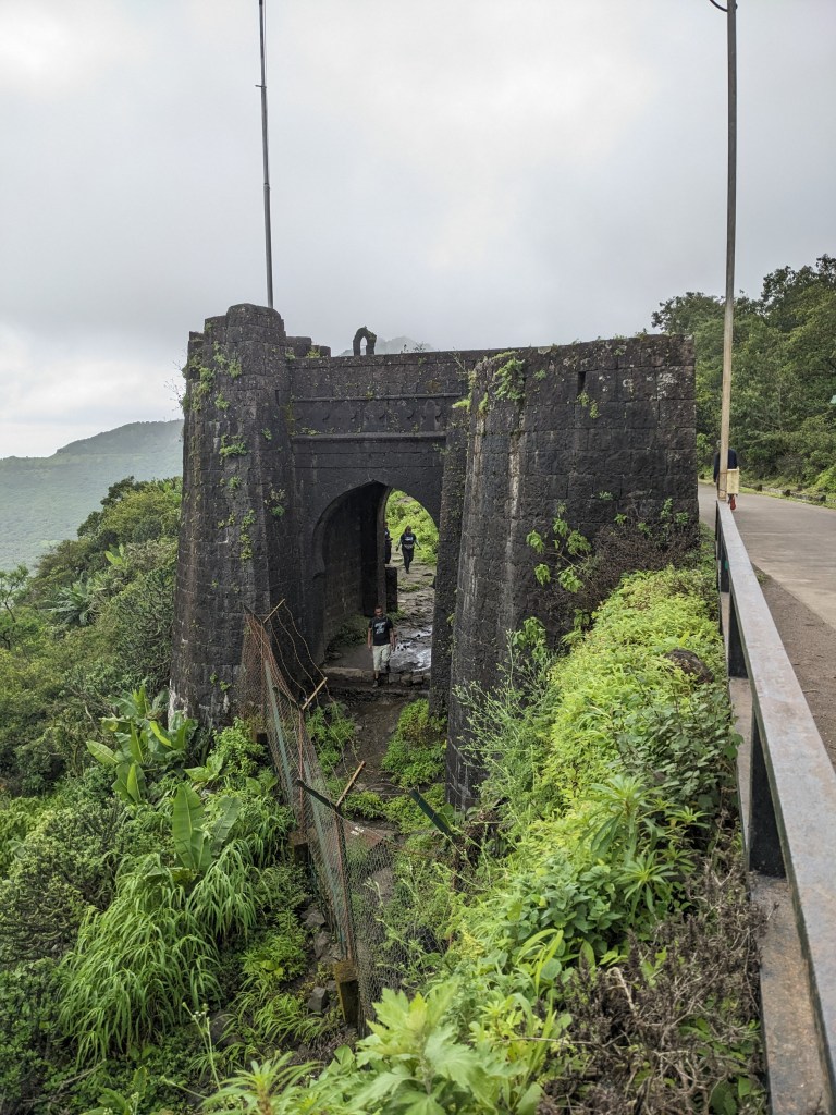 हीवाट मळलेली आहे त्यामुळे साधारण १५ मिनिटांच्या चालीनंतर तीन दरवाजे एका मागोमाग एक लागतात. ह्या दरवाज्यांची नावे अनुक्रमे , दिल्ली दरवाजा , गणेश दरवाजा आणि निशाण दरवाजा म्हणून ओळखली जातात. ह्यातील दिल्ली दरवाजातून प्रवेश केल्यावर डावीकडे पत्रे लावून वाट बंद करण्यात आली आहे. ही वाट कंदकडा अथवा खांदकडा बुरुजापाशी तसेच भैरव खिंडीकडे जाते. तेव्हा आपला पुढचा प्रवास हा बावची माचीवर होतो. ही माची केदार दरवाज्यापर्यंत (केदारेश्वर मंदिराच्या खालील दरवाजा) पसरली आहे.